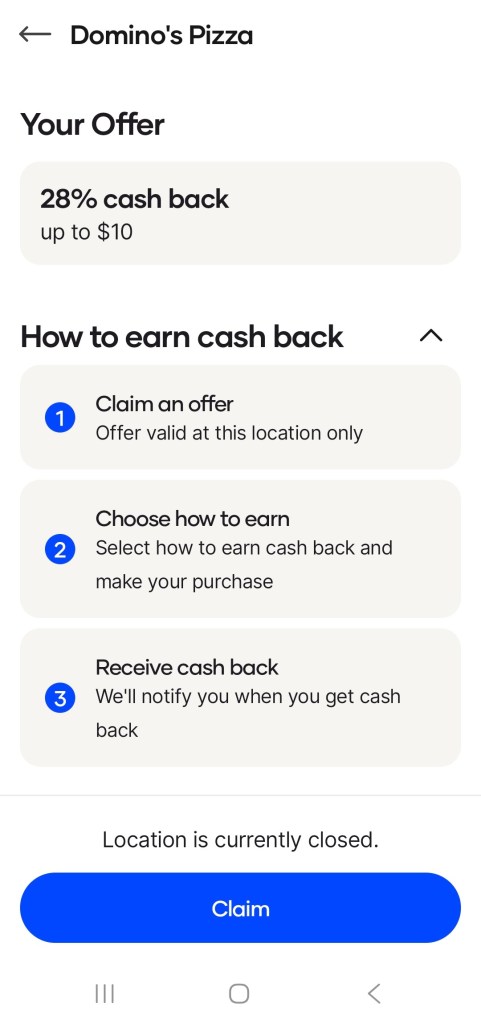 Below is a screenshot of a cash back offer from a Domino’s Pizza close to where I live. This one has a super high 28% cash back offer “up to $10.” If I was in the mood for some Domino’s, this would be a really nice offer to claim!