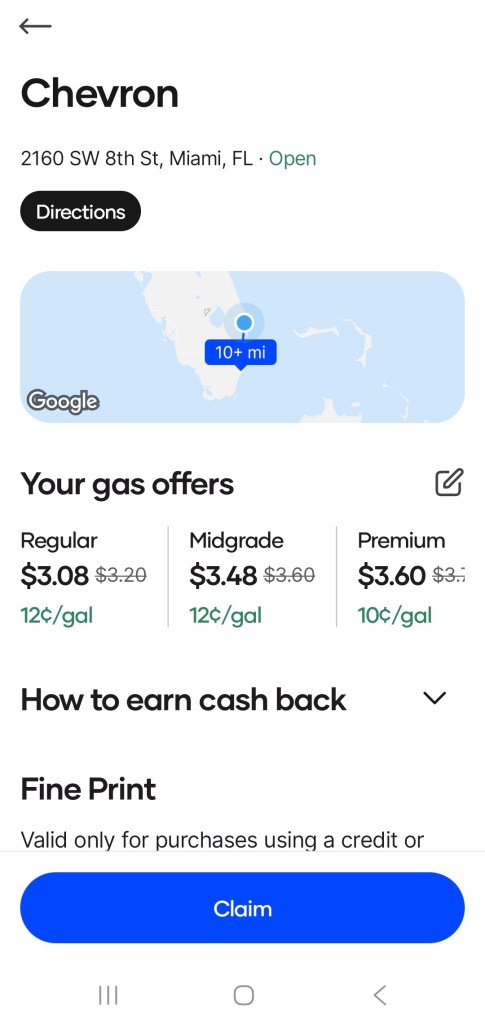 Another example that I want to mention which is an easy cash back opportunity in the Upside app is purchasing gas. You have to get gas for your vehicle anyways, so why not receive some extra cash back on your fill up? Select the “Gas” category in the app and see what gas stations near you are participating in Upside. In the app screenshot below, you can see that this gas station offers 10-12 cents cash back per gallon.